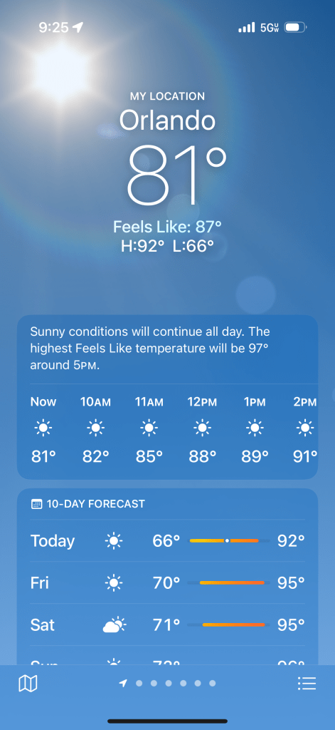 Planning a summer trip is not much different from planning any other Disney vacation. We chose mid May for a few reasons. We had DVC points that would be expiring in June. We also wanted to see Epcot’s Flower and Garden Festival. We started out same as always, by consulting various crowd calendars. This time we also consulted various climate sites about what to expect weather wise.